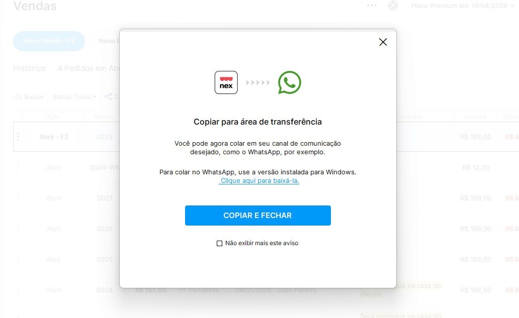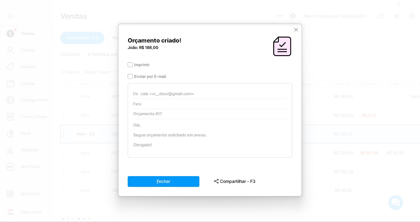 Além do e-mail, você também pode enviar uma mensagem de orçamento para o WhatsApp do cliente juntamente com o documento. Veja como isso é feito através do Nex: