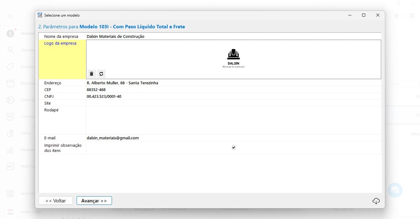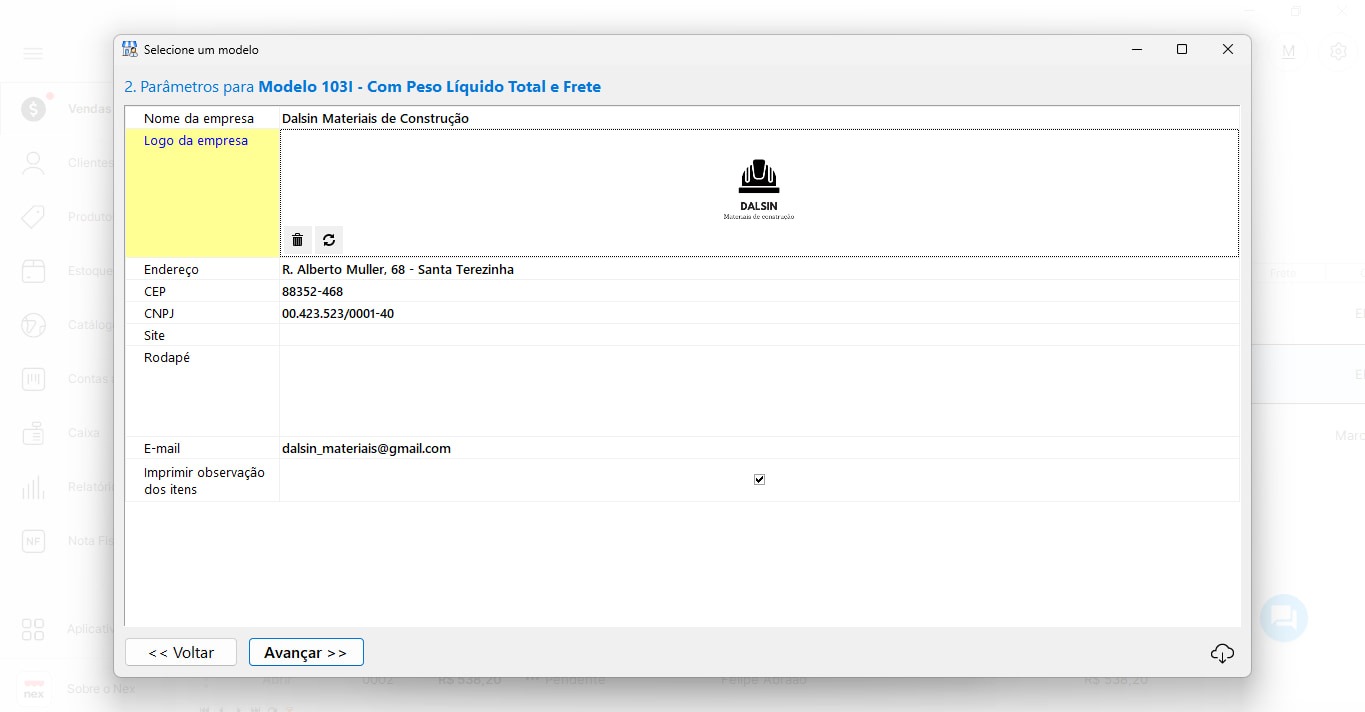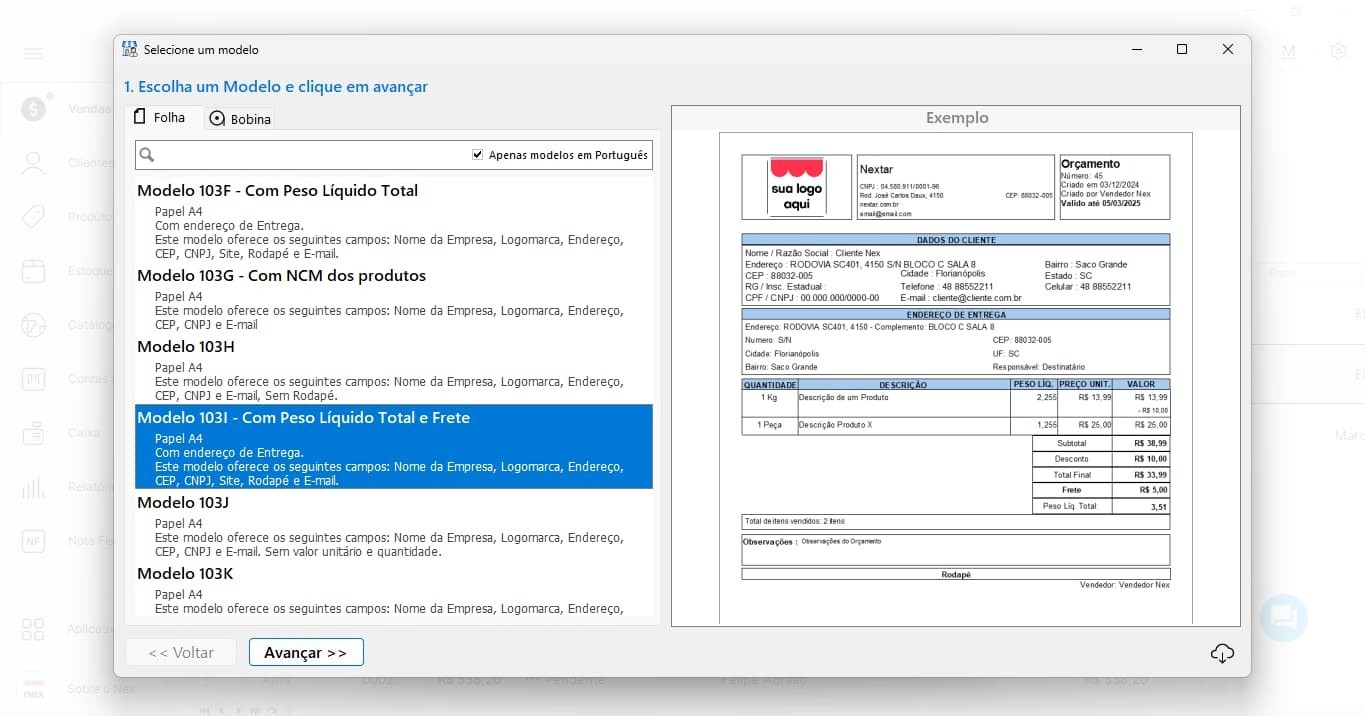 Selecione o “Modelo/Layout de Impressão” para escolher o modelo desejado, após isso clique em “avançar”, conclua com os dados da sua empresa, salve o documento criado e tenha disponível seu orçamento PDF para PC.