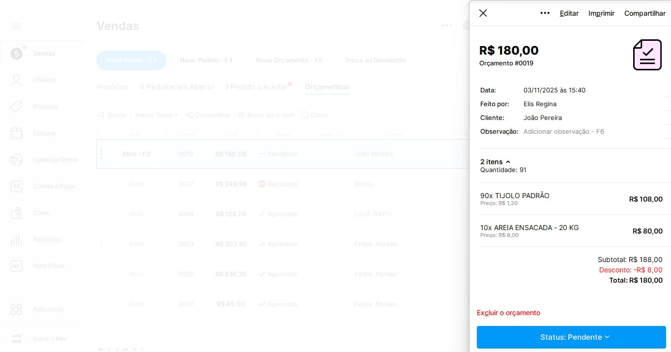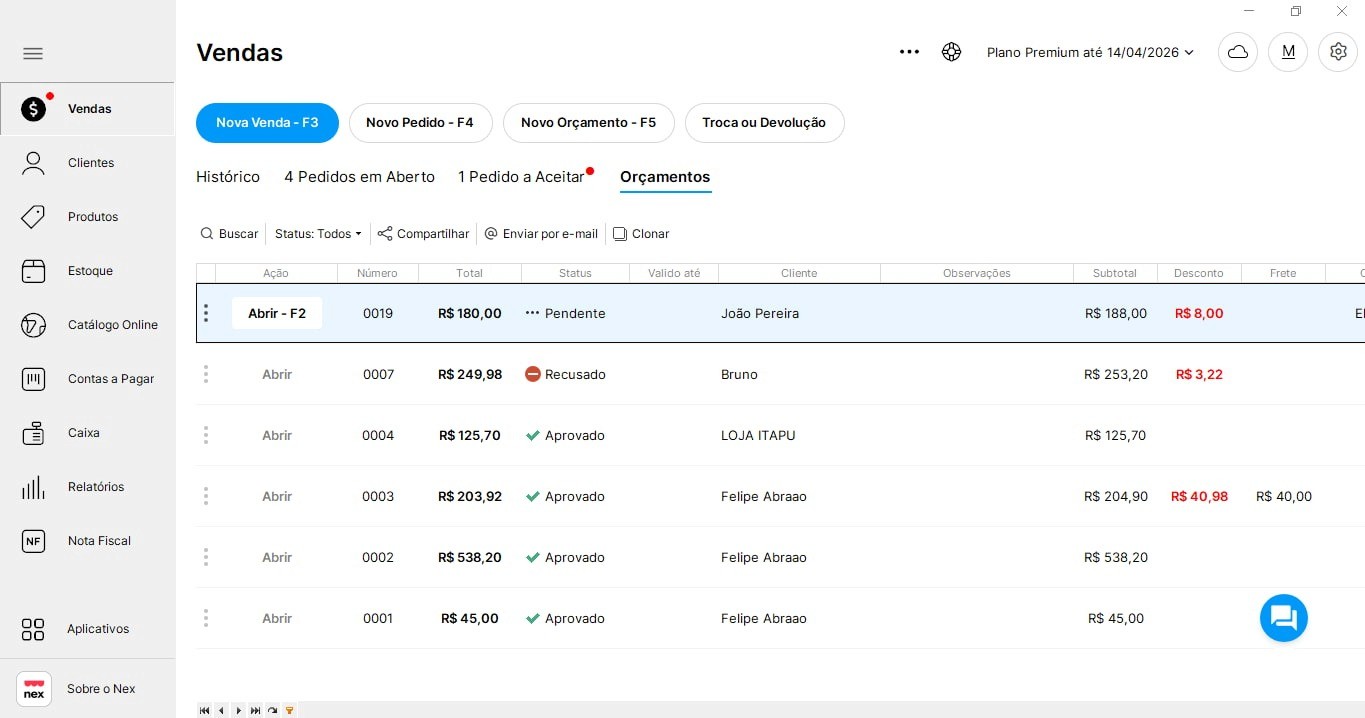 Na lista de visualização de orçamentos do Nex, você tem o controle total de cada situação dos orçamentos gerados. Os status que você pode atualizar seus orçamentos são: pendente, expirado, recusado, aprovado e vendido.