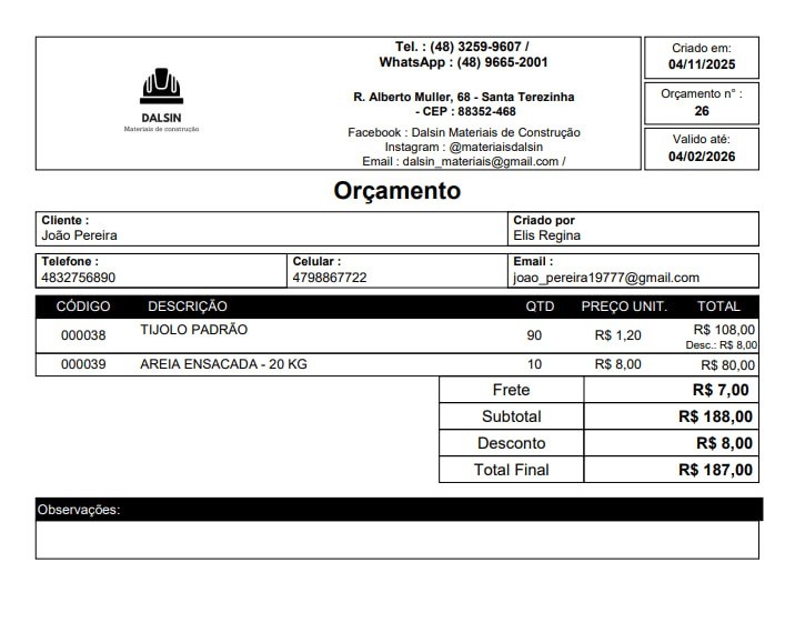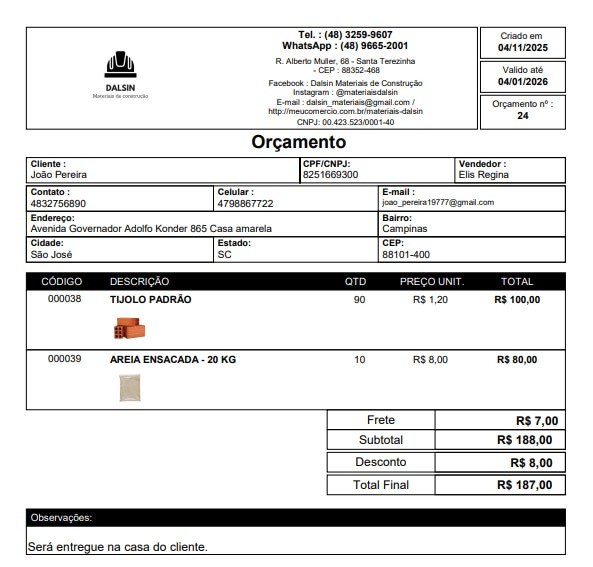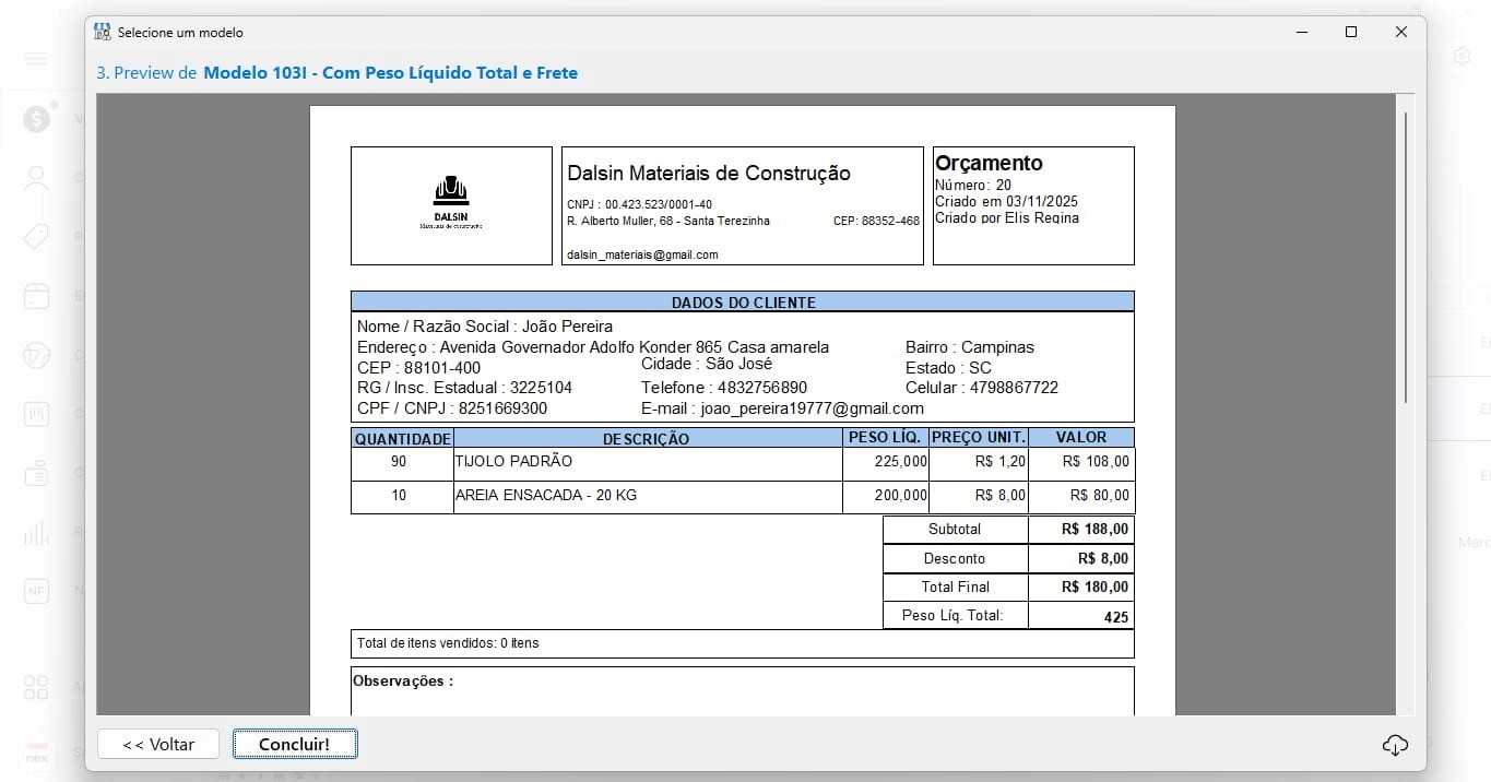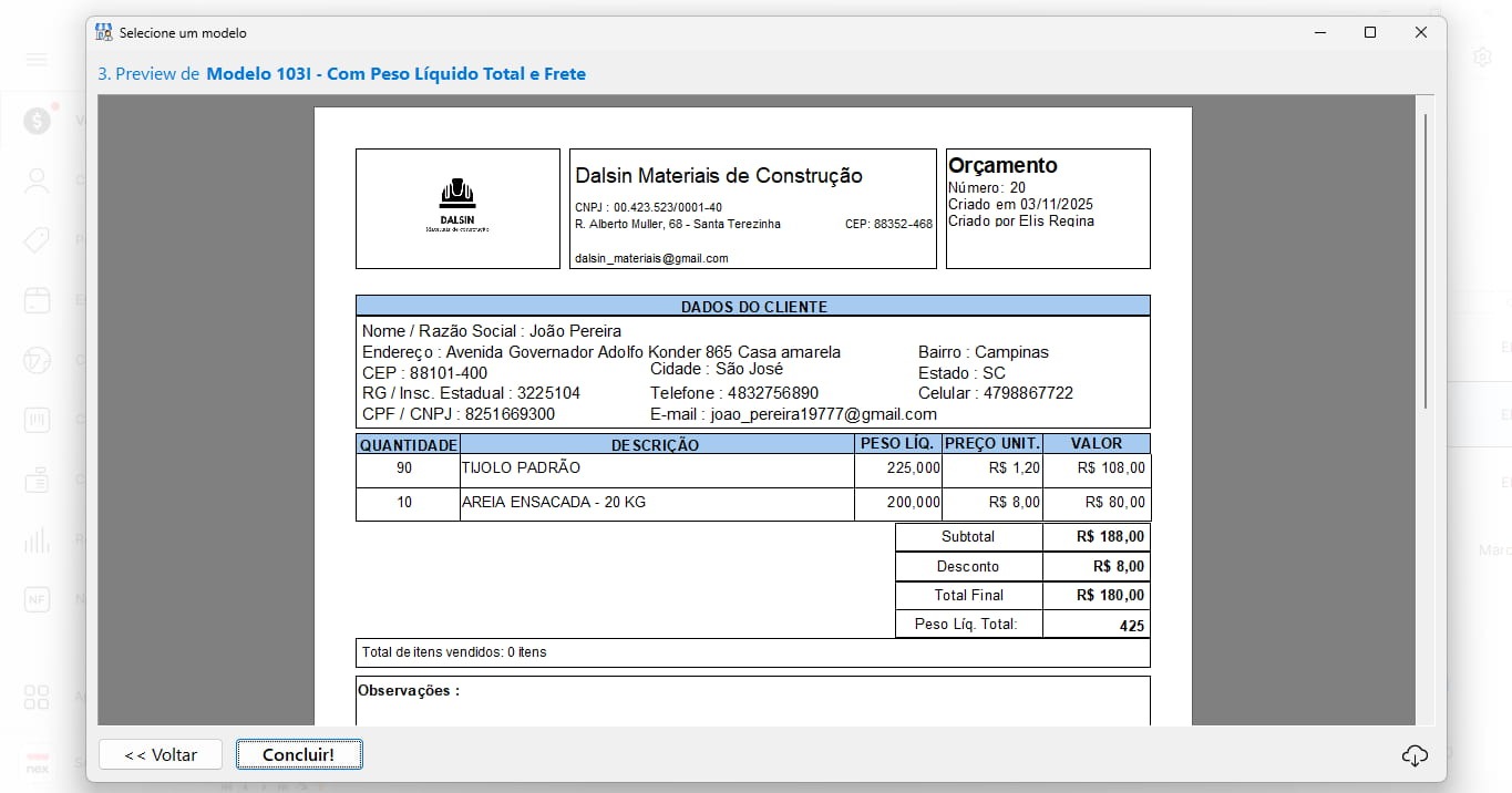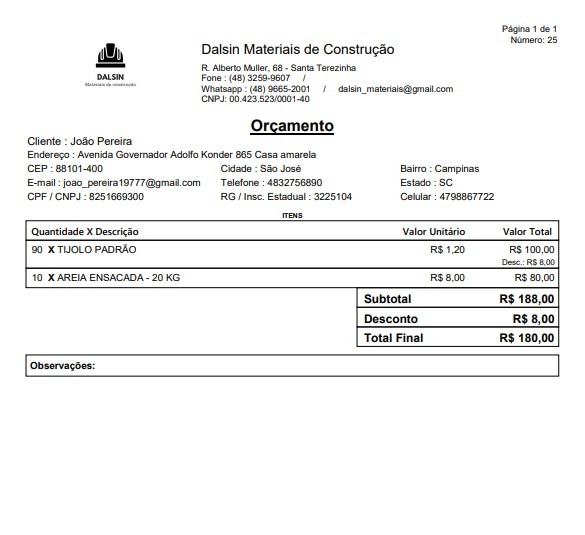 Note que esse modelo para orçamento mostra todas as informações do cliente quando o cadastro está completo. Ou seja, esse modelo funciona muito bem para o controle interno da sua loja!