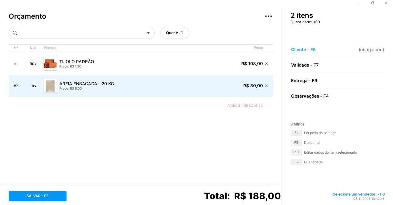 Através da tela inicial de vendas clique em “Novo Orçamento - F5” para começar. Para ver detalhes do seu histórico de orçamentos, clique na aba “orçamentos”