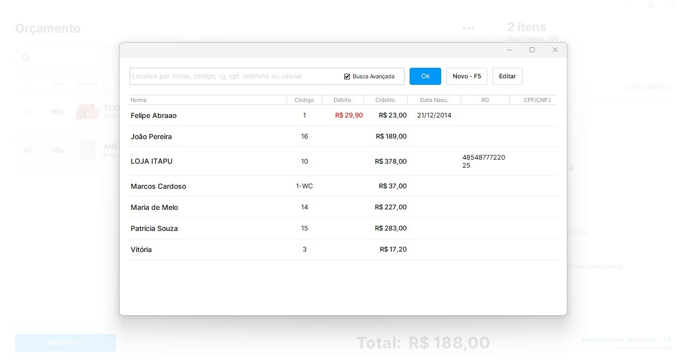 Selecione os itens solicitados, quantidade especificada e prossiga clicando na aba “Cliente” onde será direcionada a uma janela com sua base de clientes para a escolha da pessoa específica.