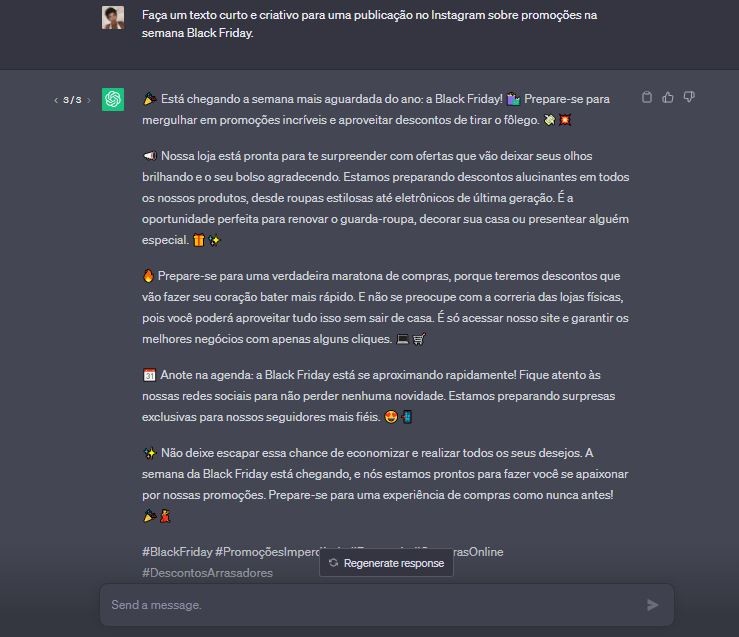 Exemplo de comando: Faça um texto curto e criativo para uma publicação no Instagram sobre promoções na semana Black Friday.