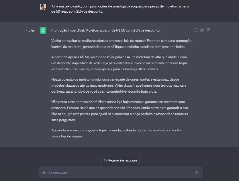 Exemplo de comando: Crie um texto curto, com promoções de uma loja de roupas, para peças de moletom a partir de 50 reais com 25% de desconto.