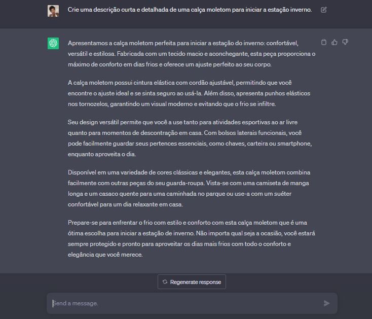 Exemplo de comando: Crie uma descrição curta e detalhada de uma calça moletom para iniciar a estação inverno.