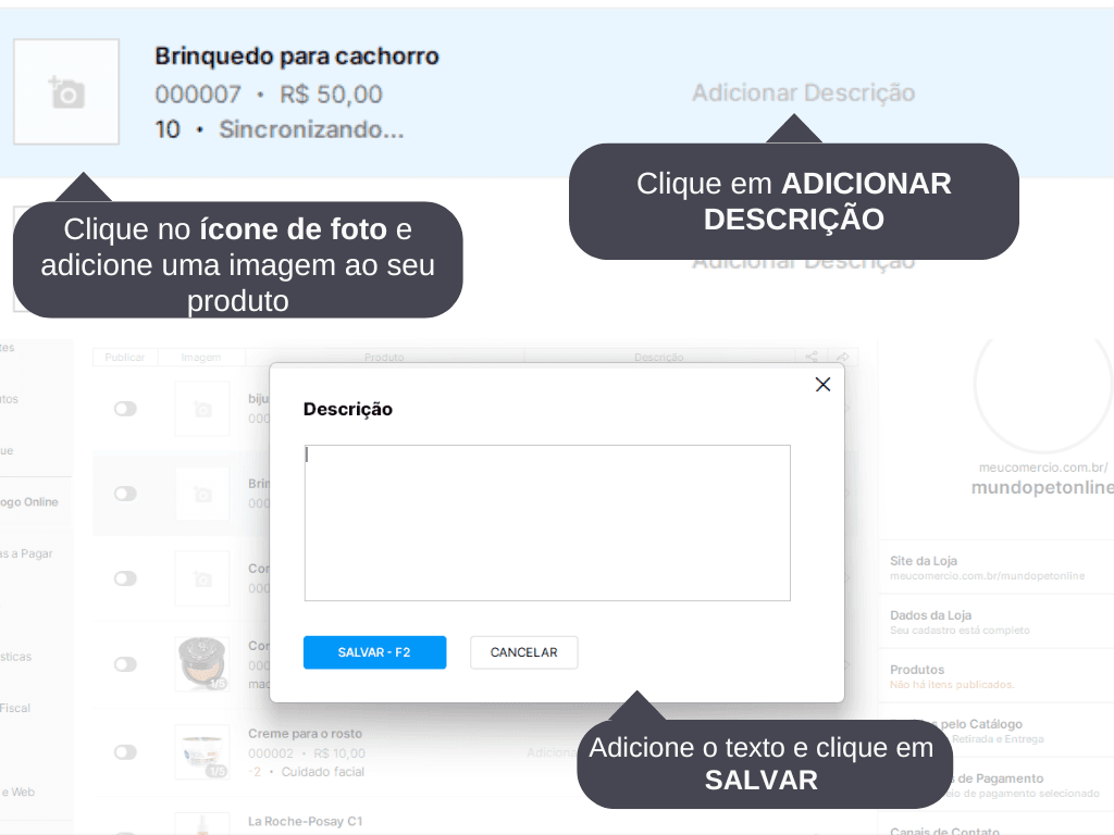 2- Para acrescentar informações nos seus produtos, clique em “ADICIONAR DESCRIÇÃO”. Você também pode adicionar fotos dos seus produtos, basta clicar no ícone da câmera e adicionar fotos aos seus produtos.