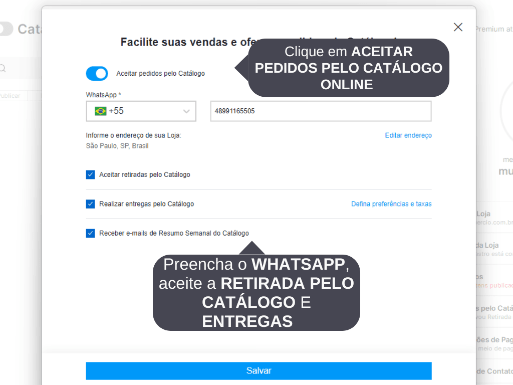4- Caso queira ativar o recurso de pedido online, clique em “ACEITAR PEDIDOS PELO CATÁLOGO". Depois, preencha os dados de whatsapp, entrega e retirada.