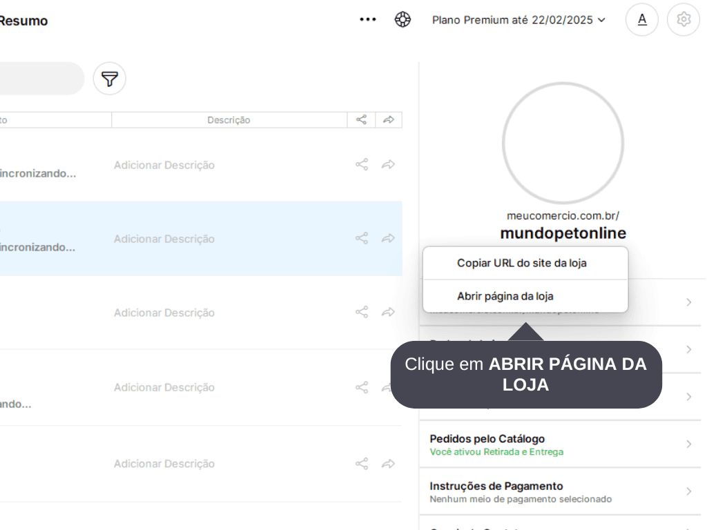 3- Para ver como está ficando o seu catálogo de produtos online, clique na url e, em seguida, clique em abrir página da loja.