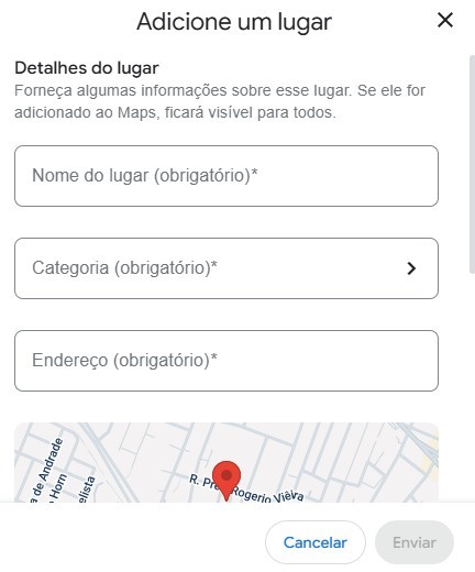 Depois clique em “adicionar um lugar que está faltando”, na barra ao lado esquerdo. Vai aparecer essa imagem: