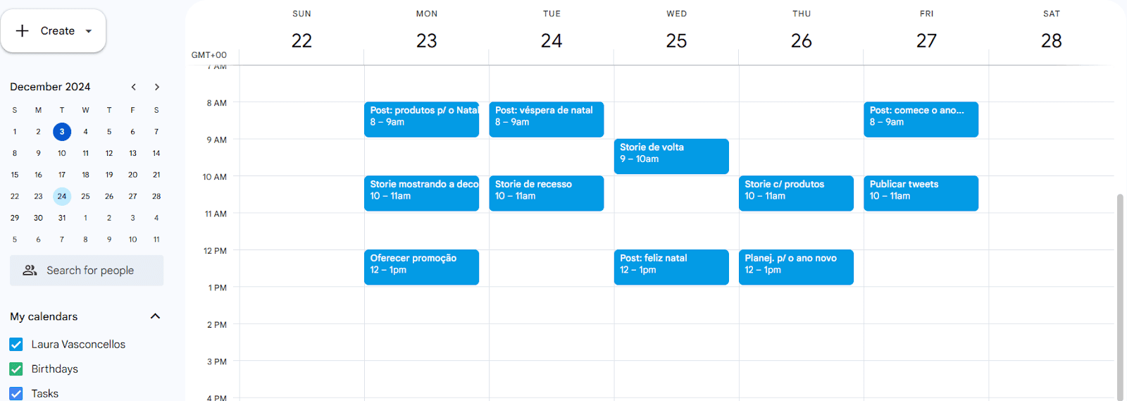 Existem algumas ferramentas online que podem ajudar você a criar o seu calendário de postagens. Uma delas é o Google Calendar, também conhecido como Google Agenda. Você pode acessá-lo por um computador, ou baixar o aplicativo através da Google Play ou da App Store, para manter o seu calendário disponível no celular.