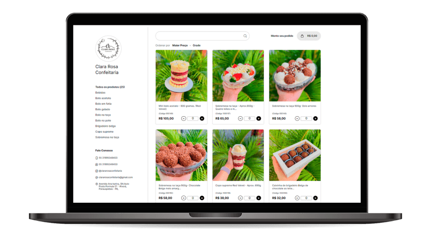 Nessa ferramenta gratuita você cadastra todos os produtos da sua confeitaria, com foto e descrição, informa o estoque disponível, divulga as principais formas de contato da sua loja e ainda aceita pedidos online para facilitar a compra do cliente.
