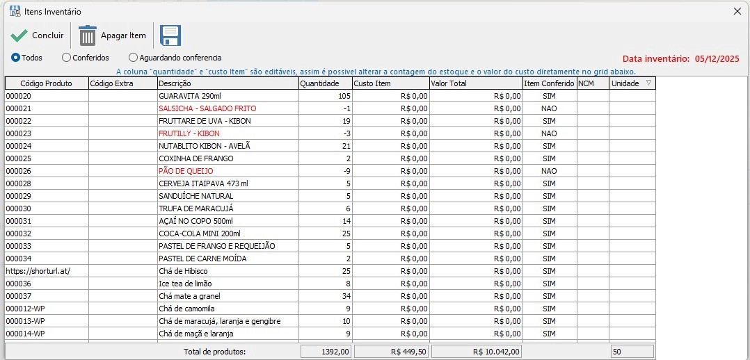 E nos casos de existir um produto com estoque negativo, seu nome vai aparecer destacado em vermelho, como mostra a tela acima. Tudo de uma forma muito simples e intuitiva para você ter acesso ao seu inventário de estoque completo em poucos minutos.
