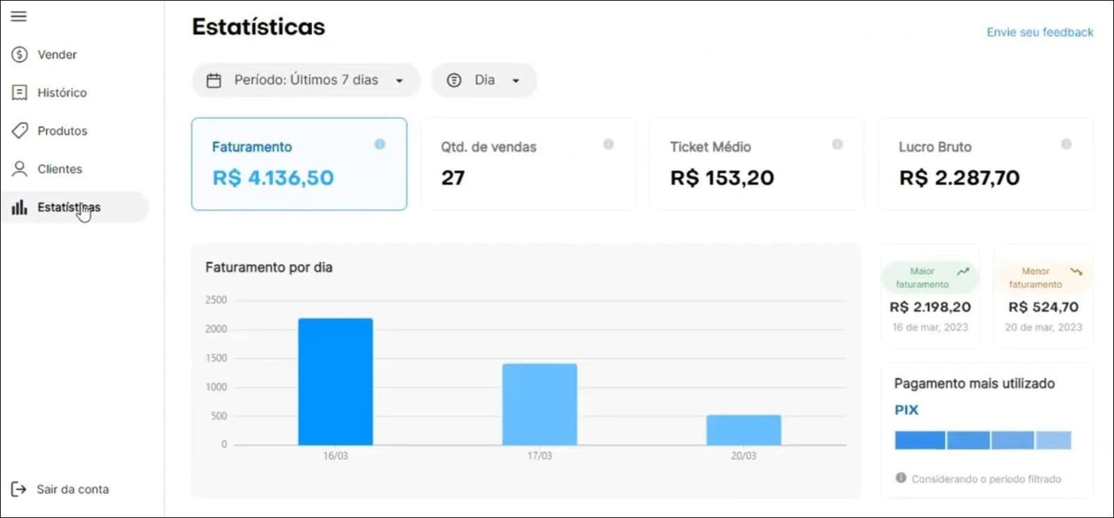 Os relatórios e estatísticas servem para informar sobre a situação que o negócio se encontra. Ele vai ajudar a calcular o ticket médio, a realizar relatórios de faturamento, a controlar os fornecedores, os clientes e as vendas.