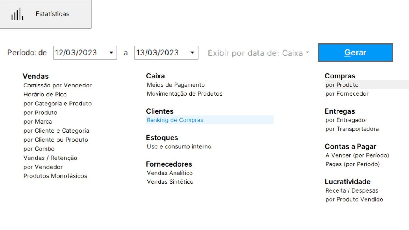 Relatórios: Gera documentos detalhados sobre clientes, vendas, fornecedores etc. de diferentes tipos e datas em questão de instantes.