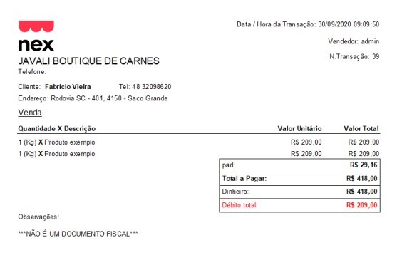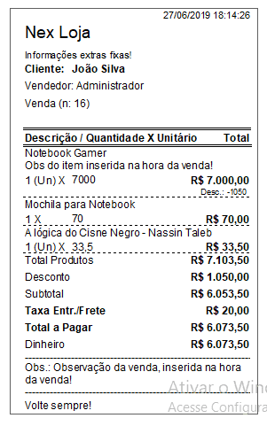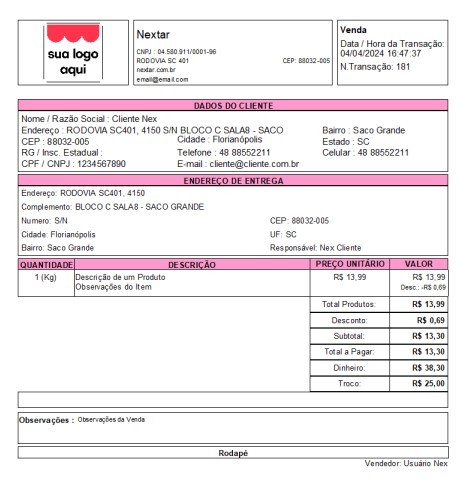 No entanto, algumas informações essenciais são: nome da loja, nome do cliente, data e hora da transação, descrição dos produtos, valores unitários e valor total, além de um campo de observações sobre a venda.
