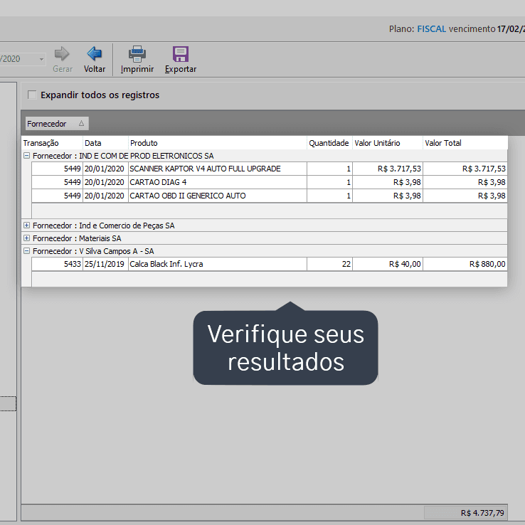 Abaixo você vê um pequeno exemplo de relatório analítico de vendas por fornecedor: