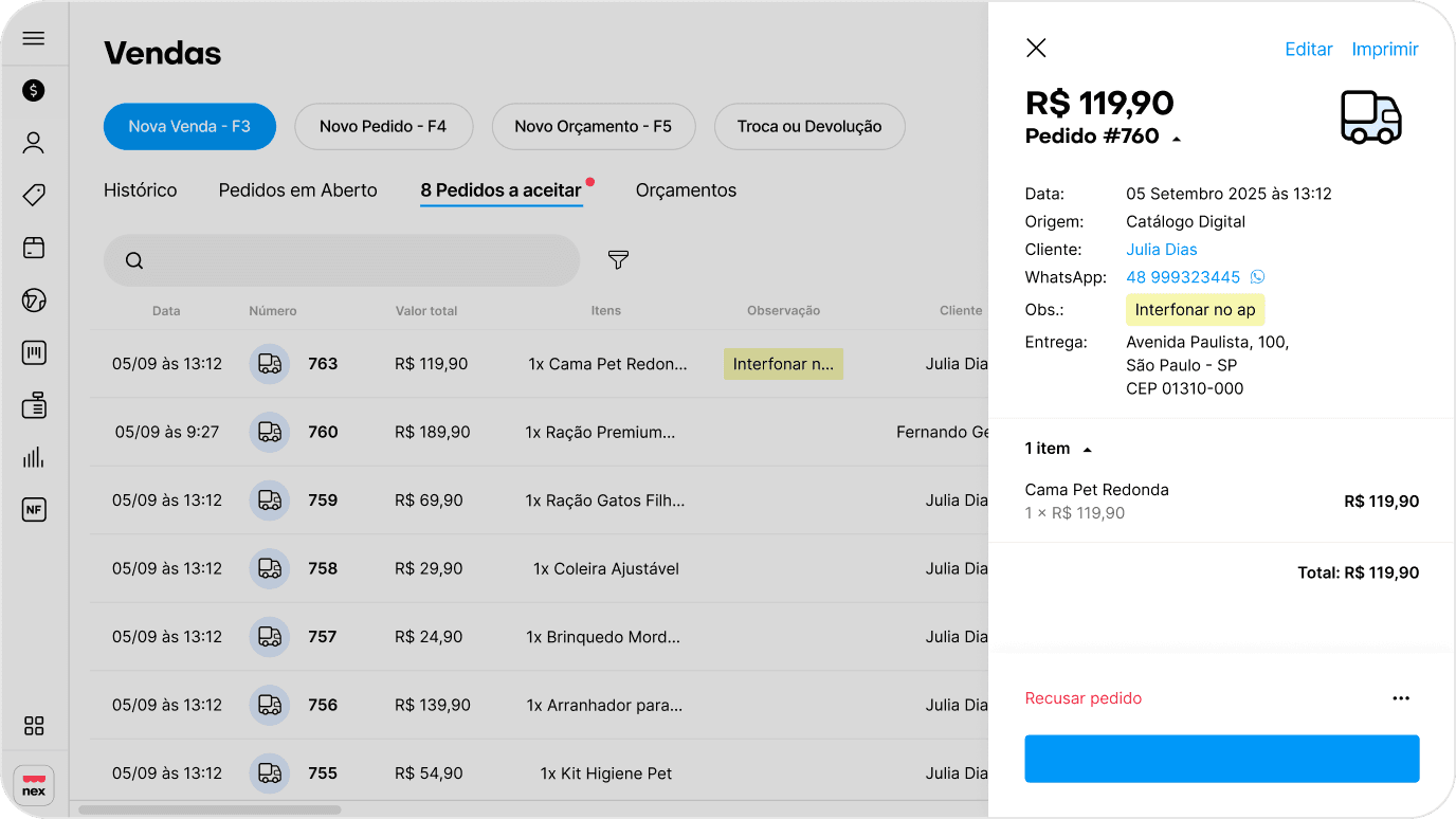 Sim. Você consegue ativar seu catálogo virtual e conferir os pedidos direto pelo aplicativo do Nex no celular.