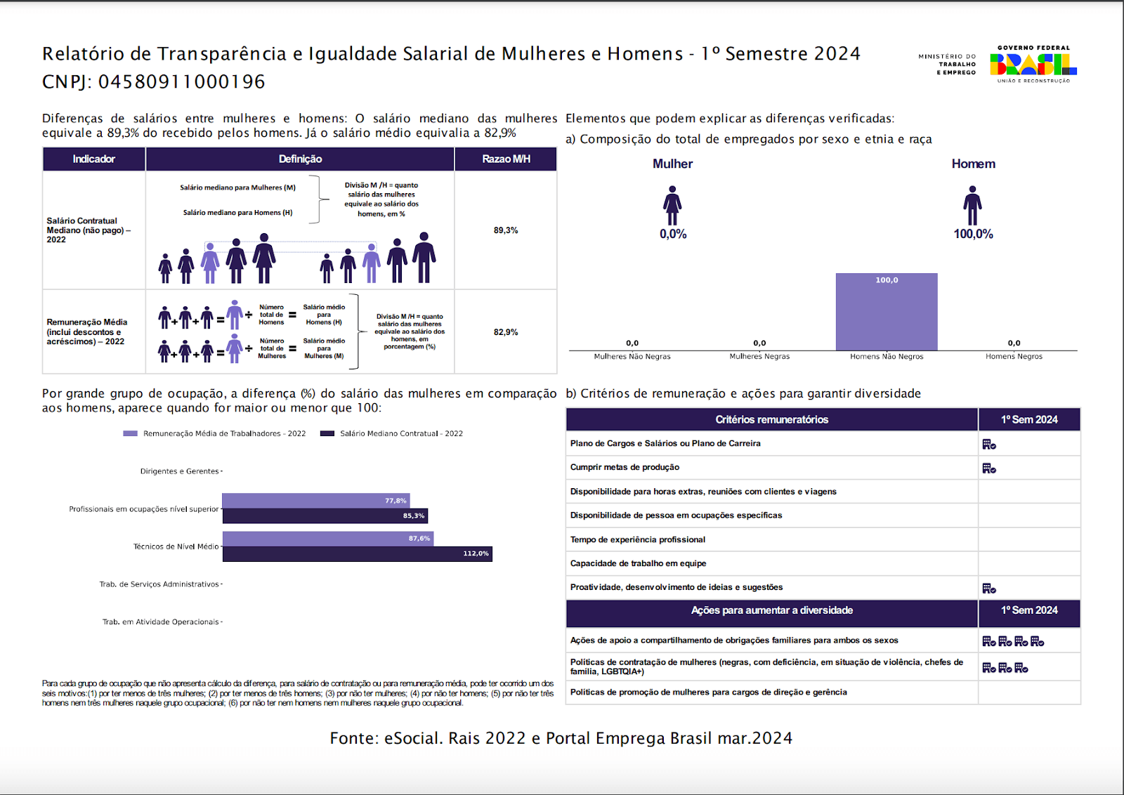 É importante ressaltar que os dados utilizados pelo relatório do MTE, são referentes ao ano de 2022, provenientes do e-Social e da Relação Anual de Informações Sociais (RAIS). Portanto, esses dados não refletem necessariamente o momento atual da empresa.