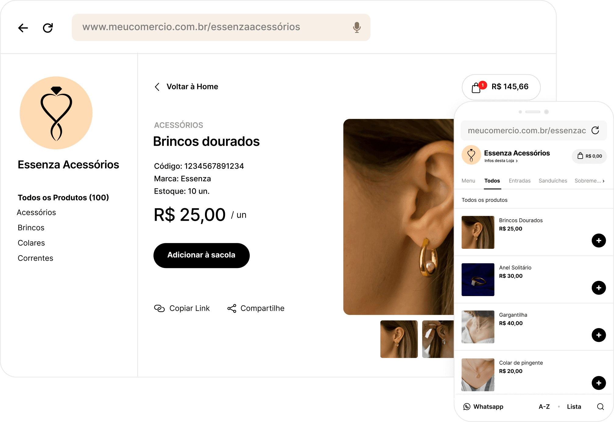 Organize seus produtos por categoria e crie um catálogo de joias e semijoias no Nex para vender suas peças. É mais alcance para seu comércio e maior autonomia para os clientes.