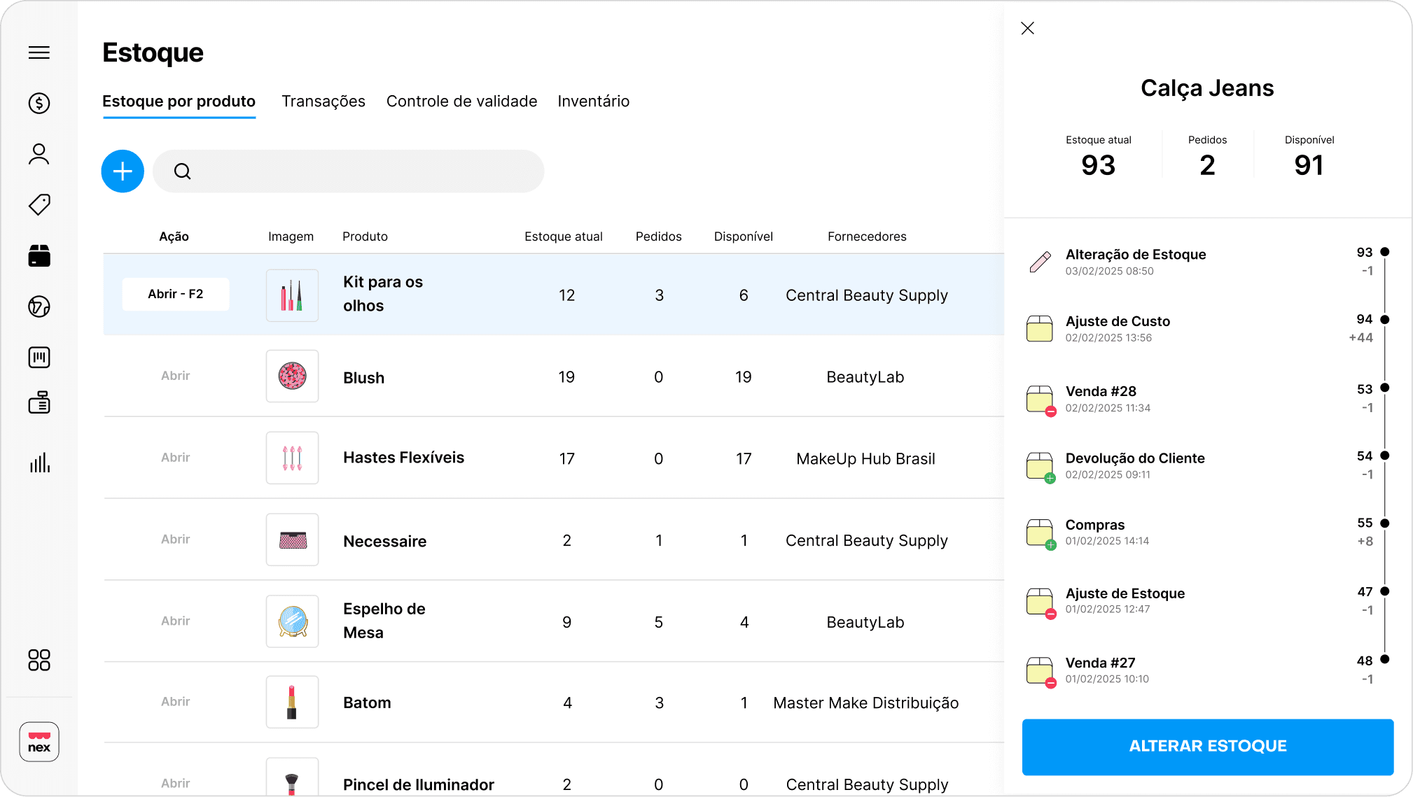 Mantenha seu estoque de maquiagem sob controle. Acompanhe o histórico de movimentações, a quantidade disponível e a validade dos produtos de forma organizada.