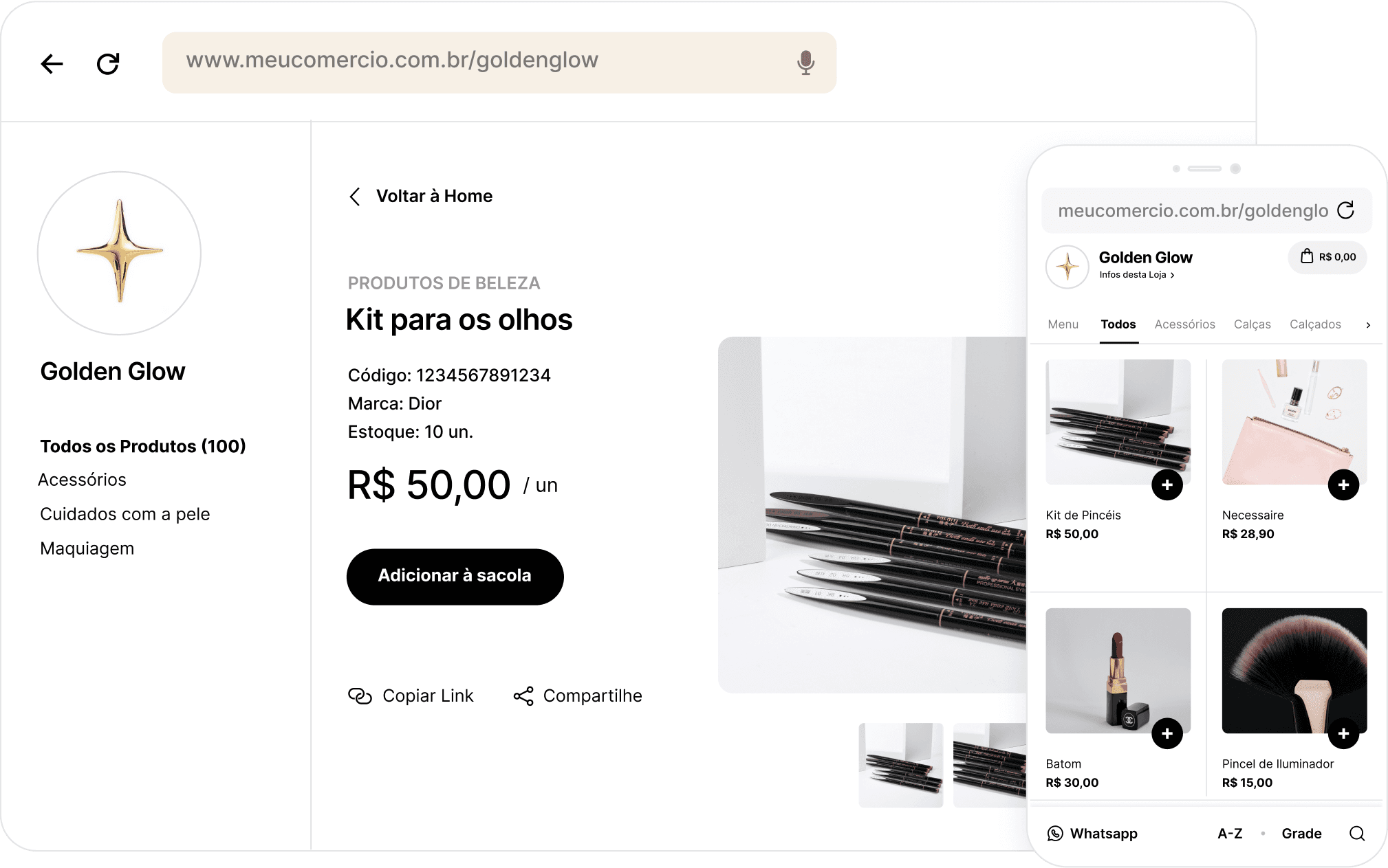 Crie seu catálogo em poucos passos, organize sua loja de maquiagem online por categoria e compartilhe nas redes sociais. É mais alcance para seu comércio e maior autonomia para os clientes.