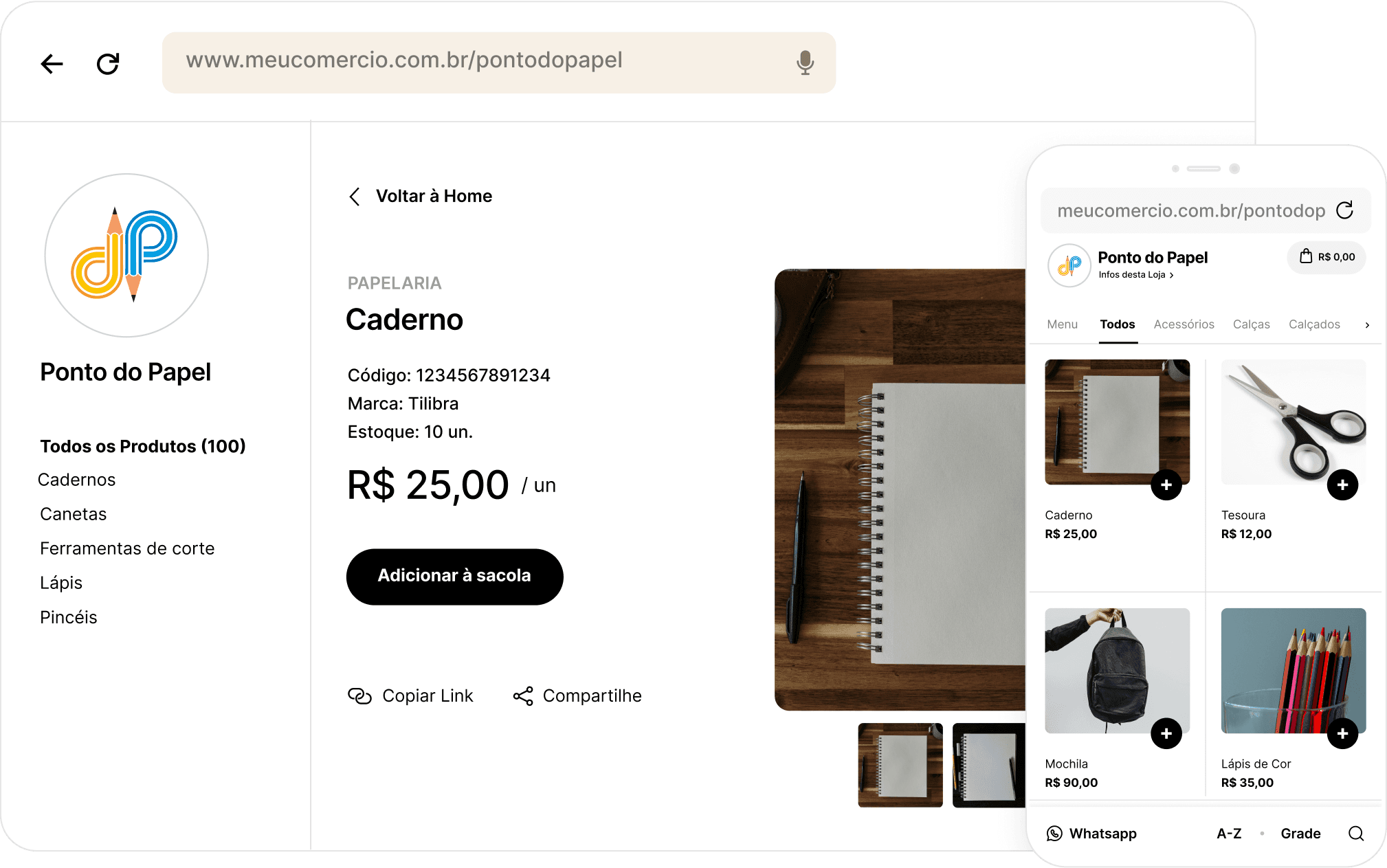 Crie seu catálogo em poucos passos, organize sua papelaria digital por categoria e venda online com o Nex. É mais alcance para seu comércio e maior autonomia para os clientes.